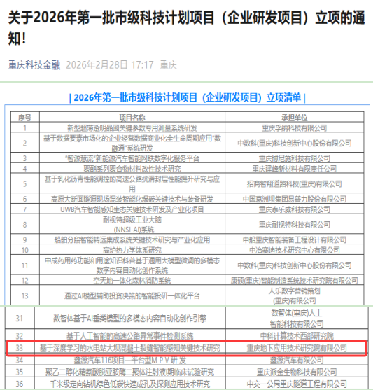 近日,重庆市科学技术局发布《2026年第一批市级科技计划项目(企业研发项目)立项清单》,经过严格的申报、评审、公示流程,重庆地下应用技术研究院有限公司(以下简称“公司”)牵头申报的《基于深度学习的水电站大坝混凝土裂缝智能感知关键技术研究》课题成功获批立项。这是市级主管部门对公司科研实力与创新方向的高度肯定,也是公司深耕智能感知与水利工程安全领域的重要成果。